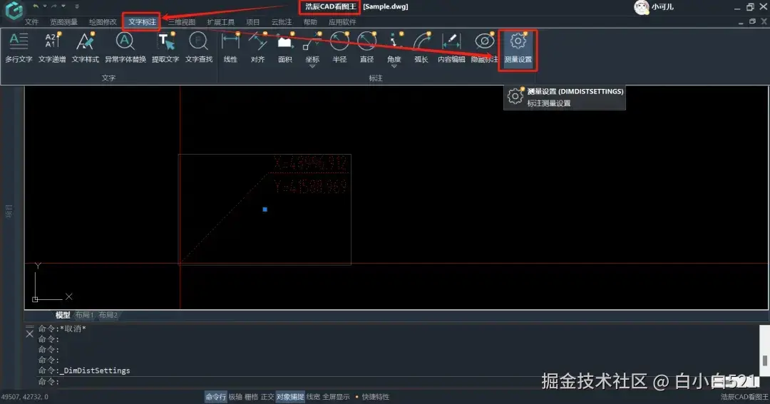 4、上图中我们标注的坐标精确到小数点后三位,如果你想要整数的坐标,点击文字标注菜单栏中的测量设置。