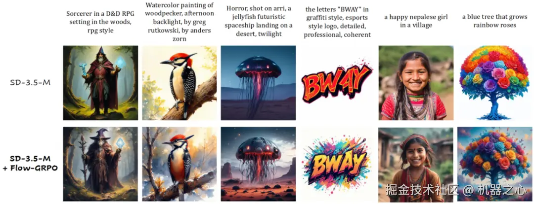 流匹配模型因其坚实的理论基础和在生成高质量图像方面的优异性能,已成为图像生成(Stable Diffusion, Flux)和视频生成(可灵,WanX,Hunyuan)领域最先进模型的训练方法。然而,这些最先进的模型在处理包含多个物体、属性与关系的复杂场景,以及文本渲染任务时仍存在较大困难。与此同时,在线强化学习因其高效探索与反馈机制,在语言模型领域取得显著进展,但在图像生成中的应用仍处于初步阶段。