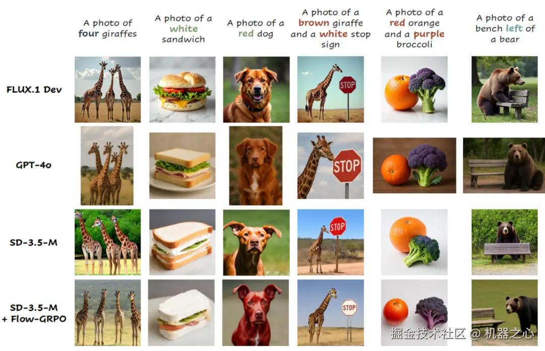 - 复杂组合生成能力大幅提升: 在 GenEval 基准上,将 SD3.5-M 的准确率从 63% 提升至 95%,在物体计数、空间关系理解、属性绑定上近乎完美,在该评测榜单上效果超越 GPT-4o!