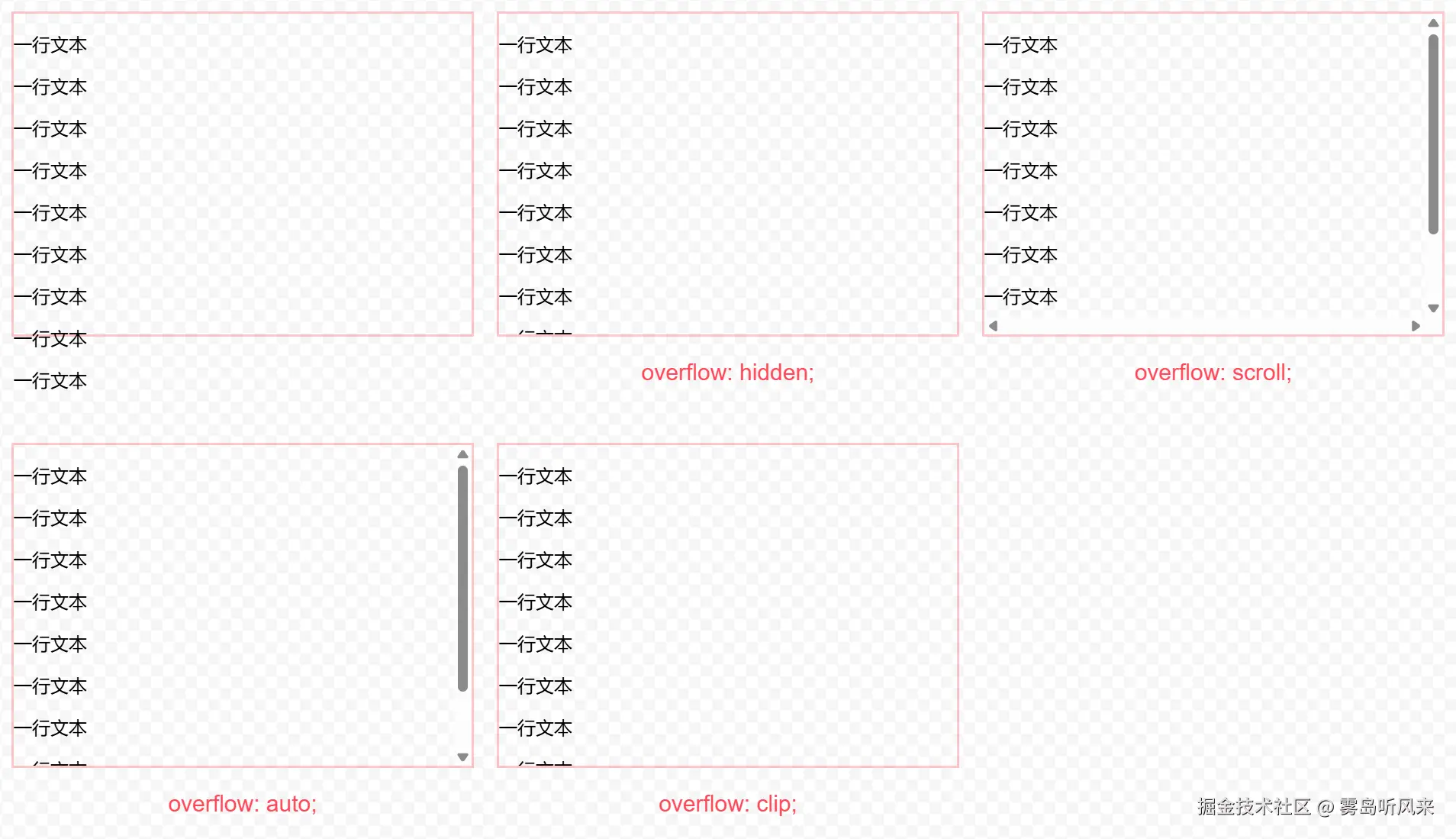 overflow 还可拆分成 overflow-x 和 overflow-y,分别控制水平方向和垂直方向的滚动条,其值于与 overflow 一致。
