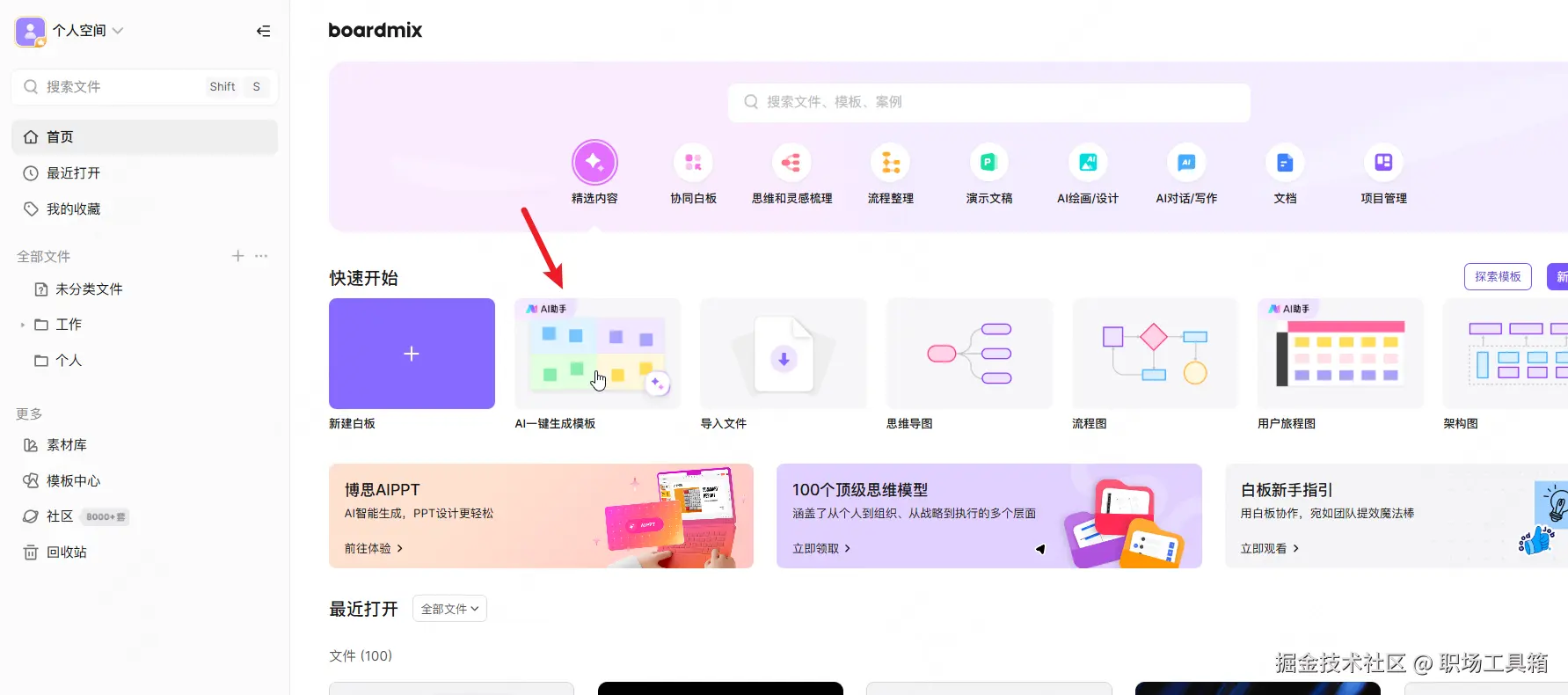 点击boardmix工作台的“AI一键生成模板”,新建一个boardmix文件,同时会自动画布右侧的“AI助手”面板。