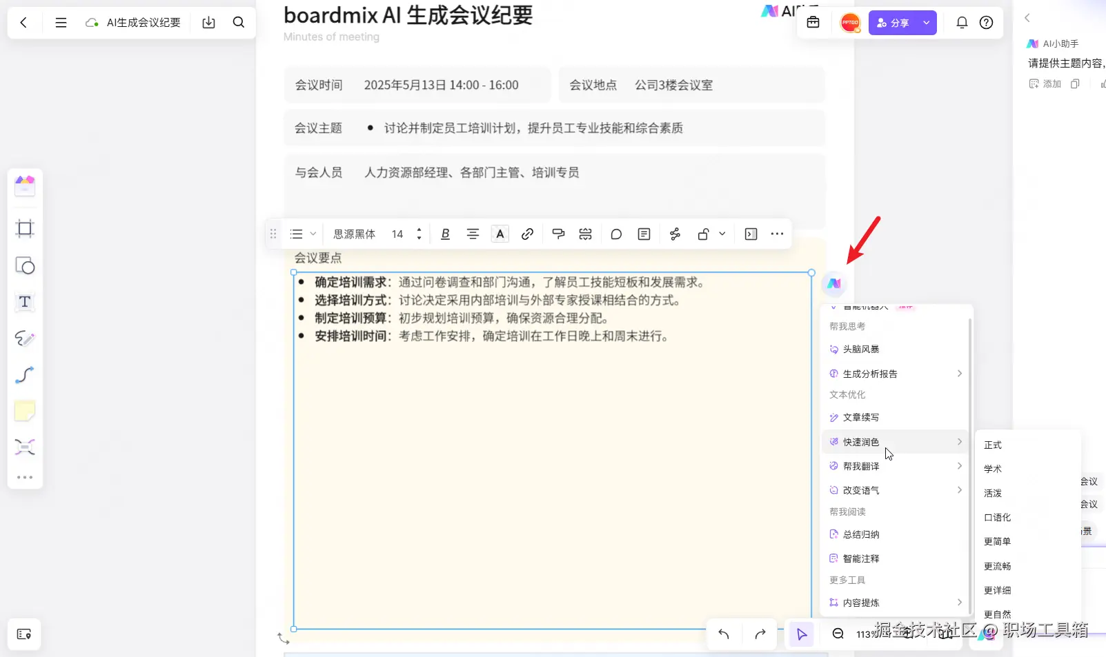 boardmix AI生成会议纪要后,如果对第一版内容不太满意,可选中内容所在的文本框,点击右侧浮动显示的“AI助手”图标,从预置的AI选项,对文本进行针对性处理——续写、润色、翻译、改变语气、总结归纳、内容提炼等。