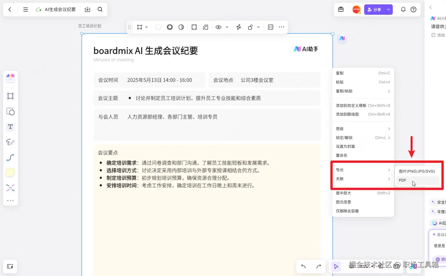 为了兼容更多的使用场景,boardmix支持将生成的会议纪要导出为多种格式,单击选中会议纪要所在的画板,右击选择“导出”,可将会议纪要导出为图片和PDF两种格式,实际使用时可按需选择,导出所需的本地文件。
