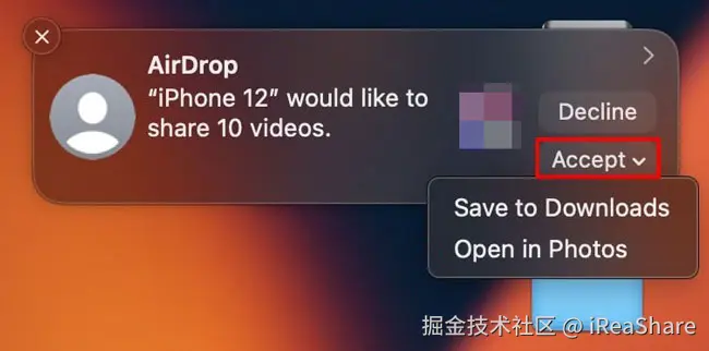 步骤 3: 选择“ AirDrop ”并选择您的 Mac。在 Mac 上接受传输请求以保存视频。