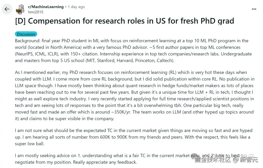【新智元导读】北美应届毕业的 ML 博士,方向为 RL,读博期间跟的是大牛导师,5 篇顶会一作,拿到的 offer 年薪却只有 35 万刀?他发帖质疑后,各位业内大佬们现身了。