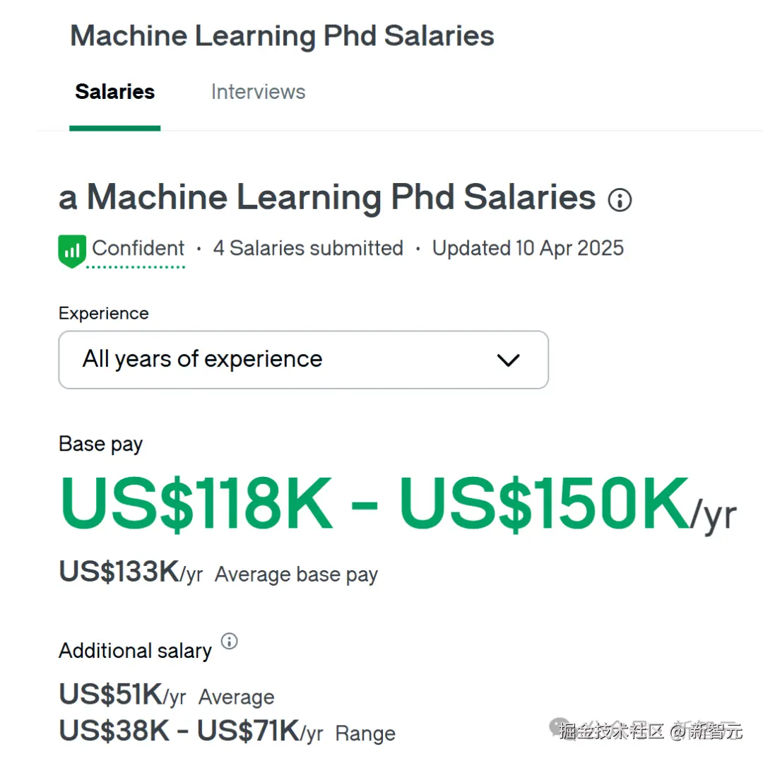 Glassdoor 上的 ML 博士基础薪酬,在 11.8 万到 15 万刀之间。
