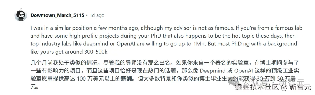 如果你特别幸运地来自著名的实验室,在博士期间参与过很有影响力的项目,这些项目还恰巧是当今热门的话,那么 DeepMind 或 OpenAI 这种顶级实验室就会向你伸出橄榄枝,薪酬可能高达百万美元。