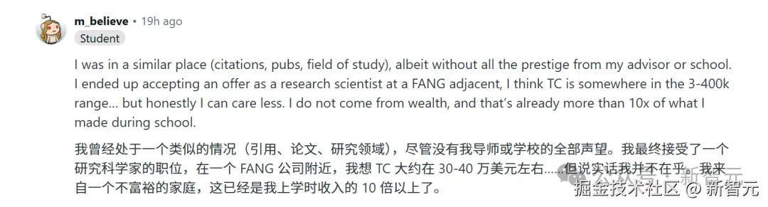 最终,他接受了一家公司的研究科学家 offer,年薪大概在 30-40 万之间。