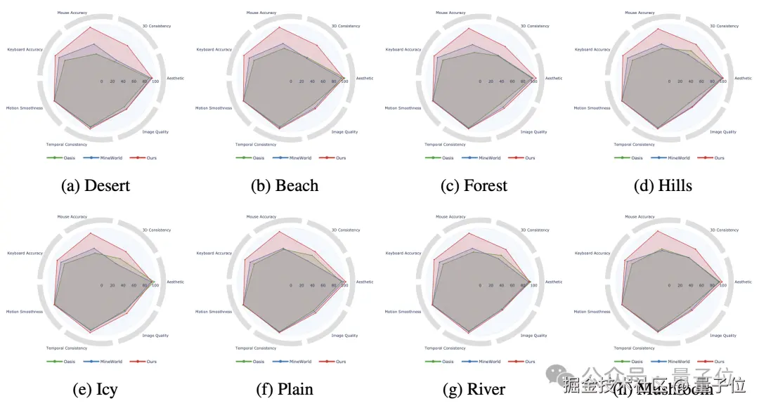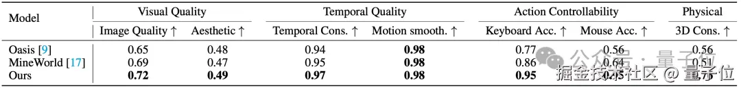 结果显示,在 GameWorld Score 评测系统中,Matrix-Game 全面超越现有开源基线模型 Decart 的 Oasis 与微软的 MineWorld,在视觉质量、时间一致性、动作可控性与物理规则理解四大维度上均取得领先成绩。