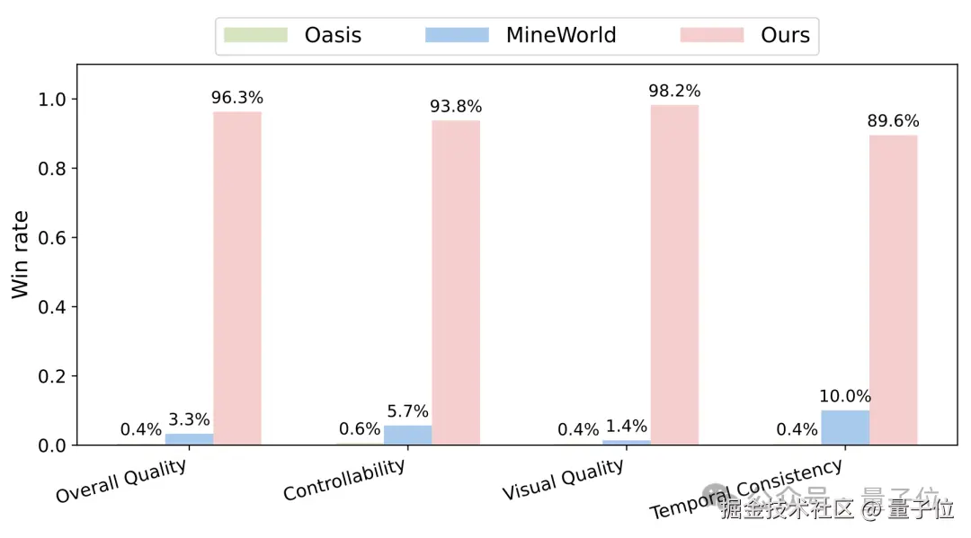 在双盲实验中,用户也更倾向于选择 Matrix-Game 生成的视频,总体偏好率达到 96.3%,细分维度上的偏好也都超过 89%,尤其是视觉质量上,偏好率达到了 98.23%。