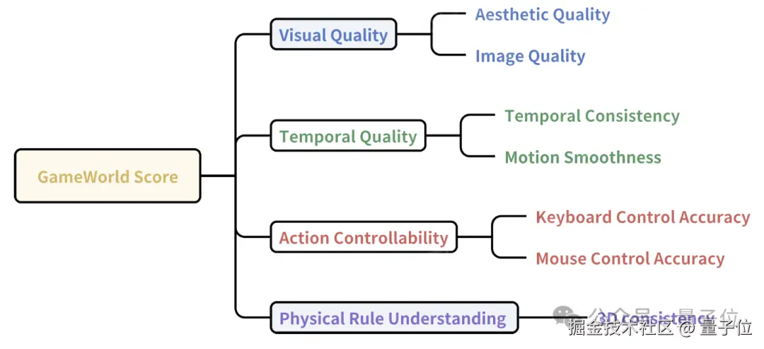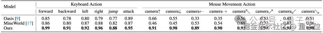 (Action Controllability):评估生成结果是否准确响应用户输入的控制信号,涵盖离散控制(如前进、跳跃)和连续控制(如视角转换)。