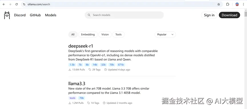 ollama是一个模型管理工具,可以通过它下载多种不同模型。ollama官网地址:ollama.com/。