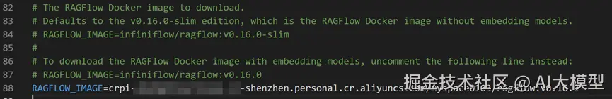 决定要下载的版本,配置文件中提供了两个版本,一个是v0.16.0-slim(第84行),一个是v0.16.0(第87行),两者的区别是,前者不会预下载嵌入模型,默认会安装前者,为了方便这里改为后者。
