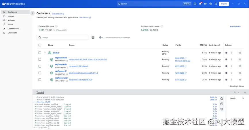 启动成功后,在Containers中就会出现ragflow相关组件。