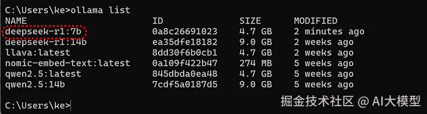 可以通过ollama list命令查看已安装的模型。