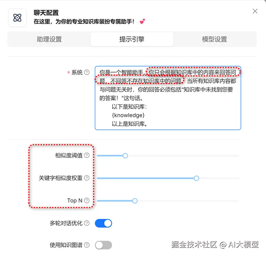 在窗口中根据需要修改提示词,因为我需要助手严格按知识库中的内容作答,不要回答其他内容,所以在默认的提示词基础上做了一点修改。