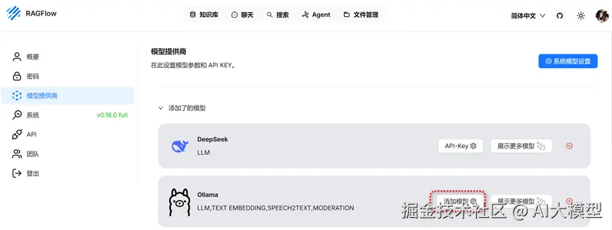 点击“模型提供商”,在列表中找到自己期望的模型供应商,以DeepSeek为例,点击“添加模型”。