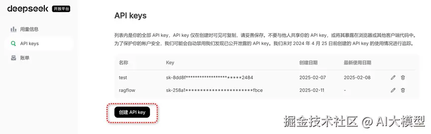 在API Keys中,创建API key。然后复制并保存。