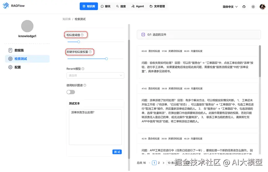 再根据上一步添加知识库时的测试,设置合适的相似度阈值和关键词相似度权重。