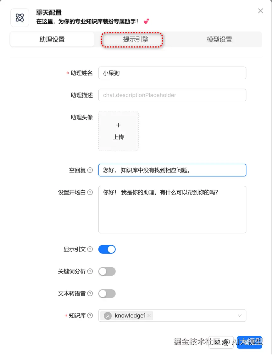 给助理设置一个姓名,最底部的知识库中选择刚刚创建的知识库。