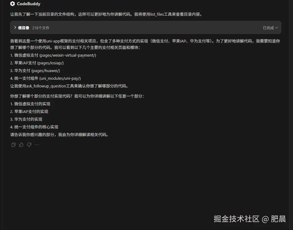 最近接手了一个基于uni-app的支付项目,代码量相当庞大,包含了微信支付、苹果IAP、华为支付等多种支付方式的实现。面对这样一个复杂的项目,我决定尝试用CodeBuddy来帮助快速理解代码结构。