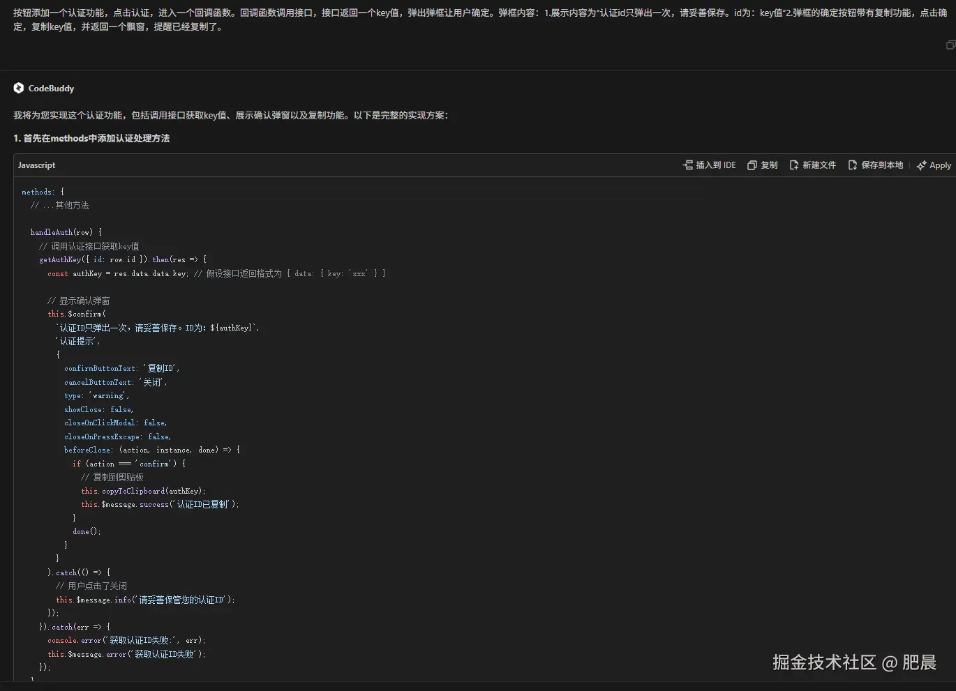 输入指令:”按钮添加一个认证功能,点击认证,进入一个回调函数。回调函数调用接口,接口返回一个key值,弹出弹框让用户确定。弹框内容:1.展示内容为“认证id只弹出一次,请妥善保存。id为:key值”2.弹框的确定按钮带有复制功能,点击确定,复制key值,并返回一个飘窗,提醒已经复制了。“