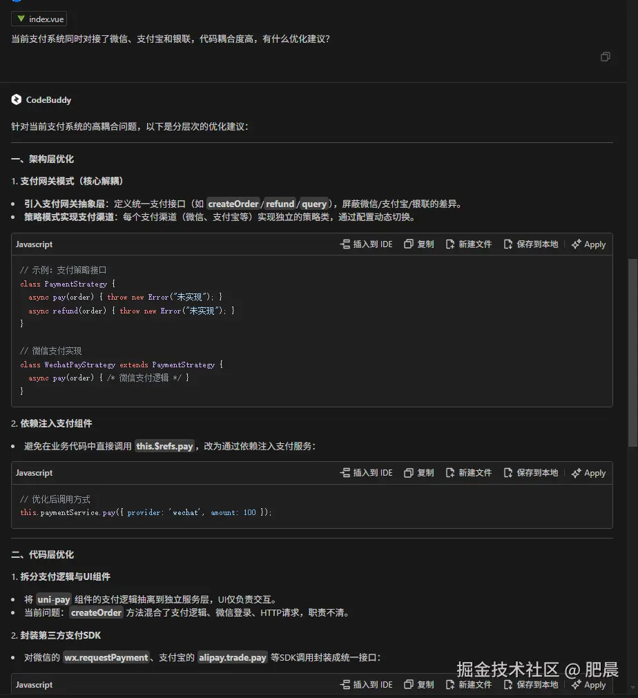 跨平台支付系统优化:传统开发在面对不同支付平台(如微信、支付宝、银联等)时,往往需要手动优化和调整支付流程的耦合度,而CodeBuddy能够快速分析并提出优化建议,减少了开发者的工作量。