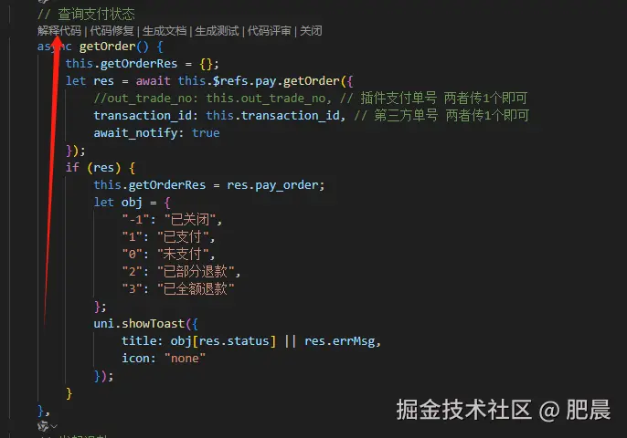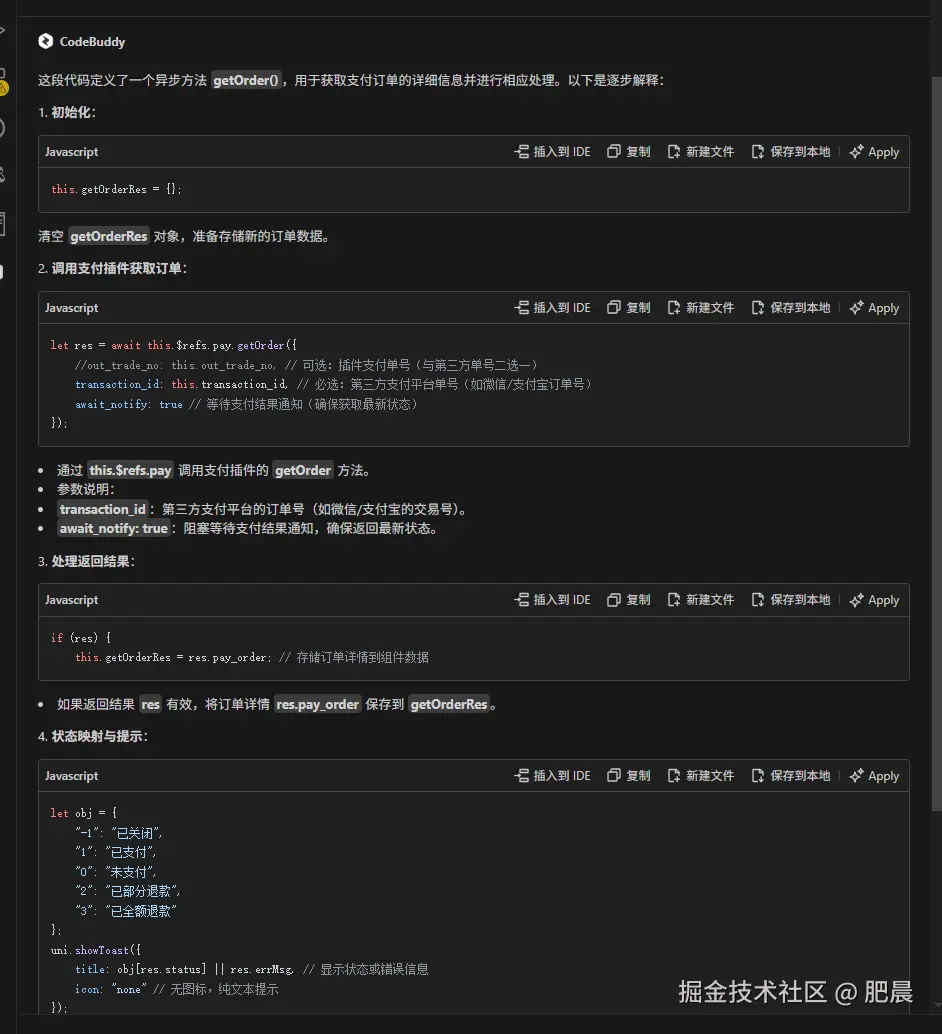 更令人惊喜的是,CodeBuddy支持对具体代码片段的详细解释。比如对于支付订单查询功能: