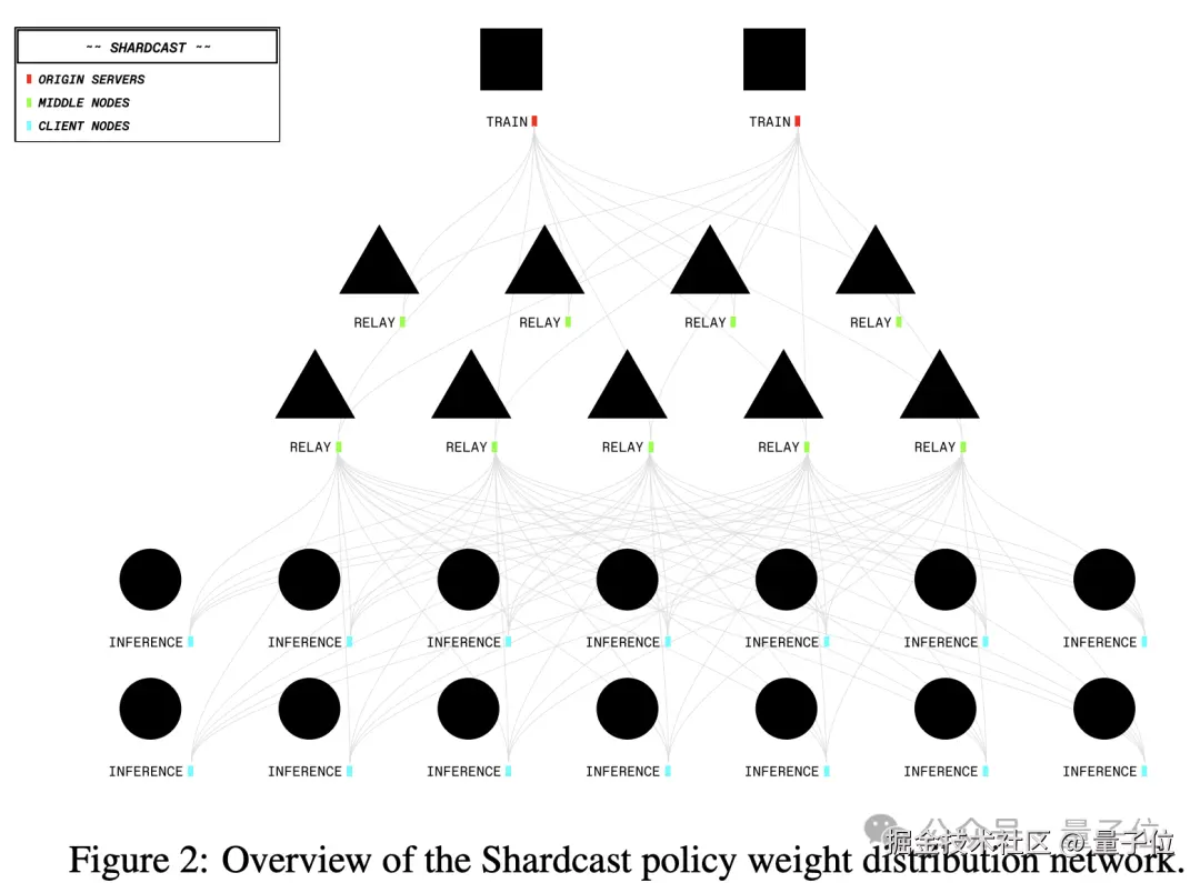 另外,与普通的被动响应式传输不同,SHARDCAST 的中继服务器会主动跟踪每个推理节点的权重版本,当发现版本落后时,会主动将增量权重推送给节点,确保了权重更新的实时性。
