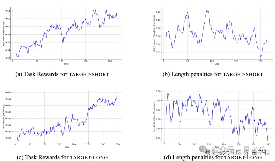 TARGET-LONG:任务奖励同样大幅提升,长度惩罚也呈下降趋势,但在实验的有限时间内尚未完全收敛,模型还未完全学会严格遵守思考预算。