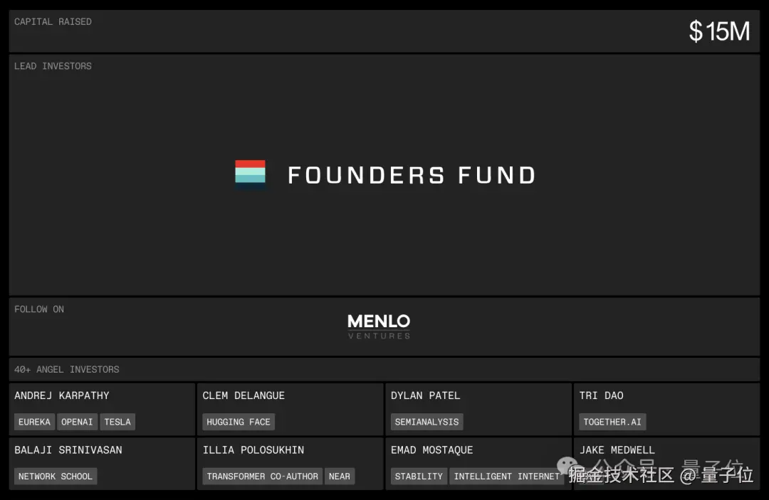 这笔投资由创始人基金领衔,投资者中还包括大神 Karpathy、Hugging Face 联创兼 CEO Clem Delangue、FlashAttention 作者 Tri Dao、Stability AI 前 CEO Emad Mostaque 等 AI 界名人。