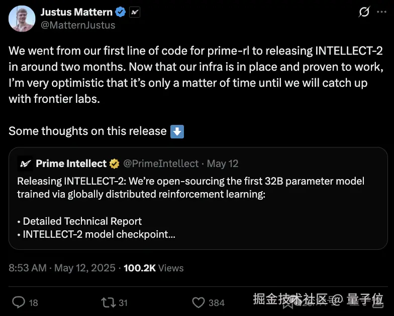 据团队成员介绍,他们从编写模型强化学习框架 prime-rl,到今天发布大概只用了两个月时间。