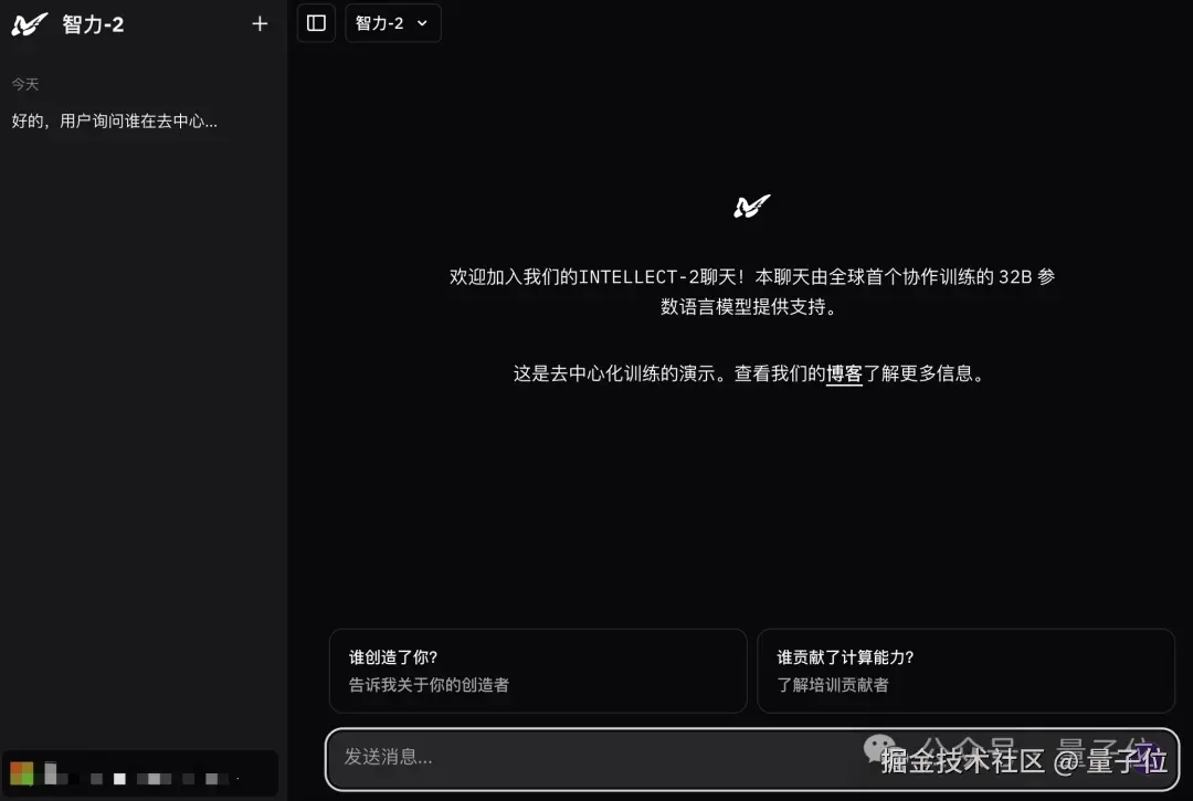 目前 INTELLECT-2 支持网页端体验,只需简单注册就可以使用。与其他通用助手页面类似差不多,不过输入仅支持文本。