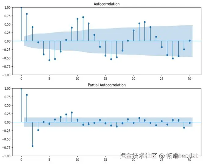 观察上图可以发现,ACF在lag=1后突然截尾,可以判断q=1。PACF在lag=2后截尾,可以判断p=2。这为模型定阶提供了重要依据。