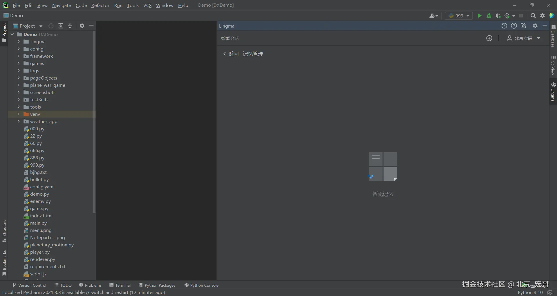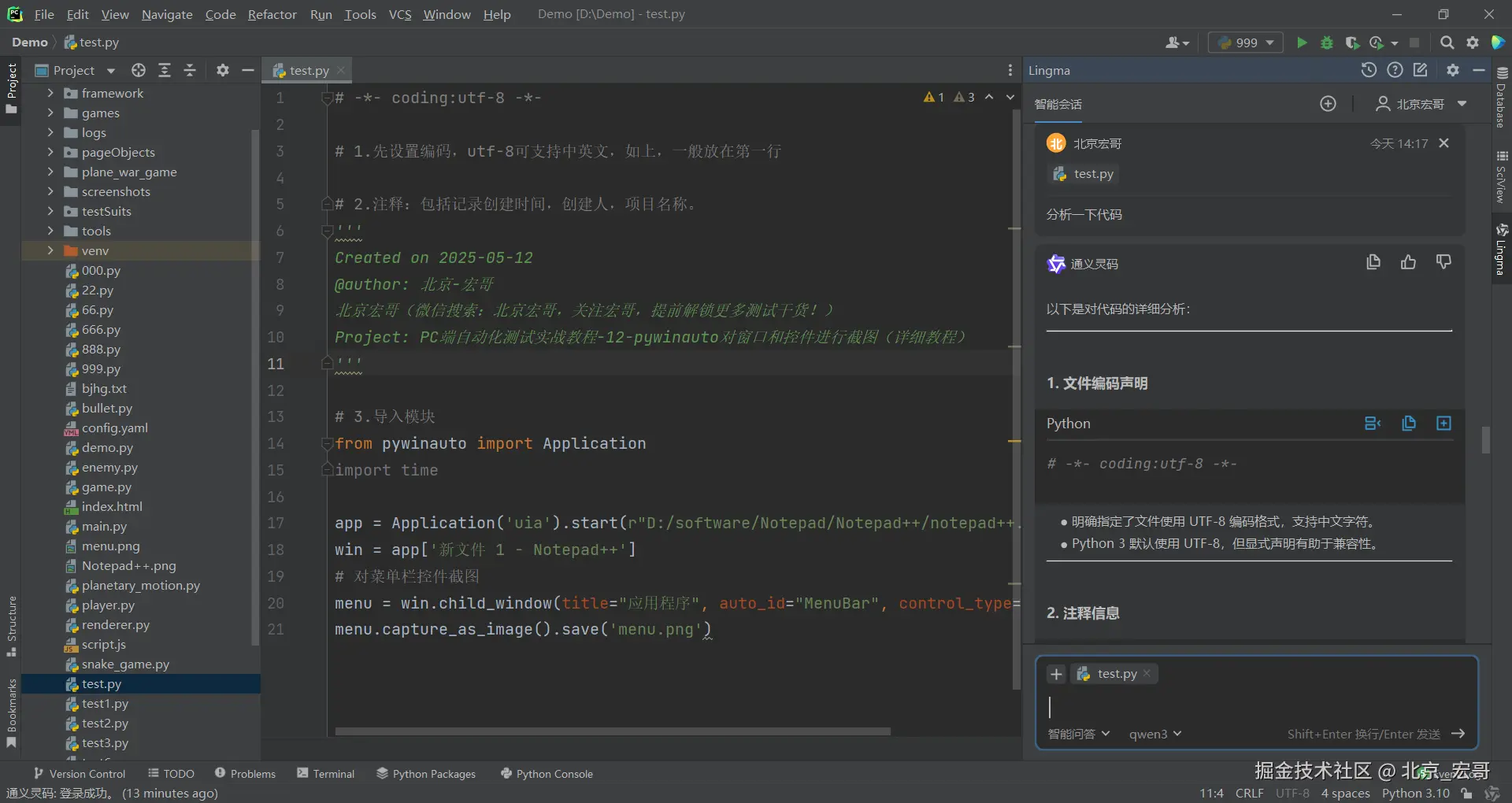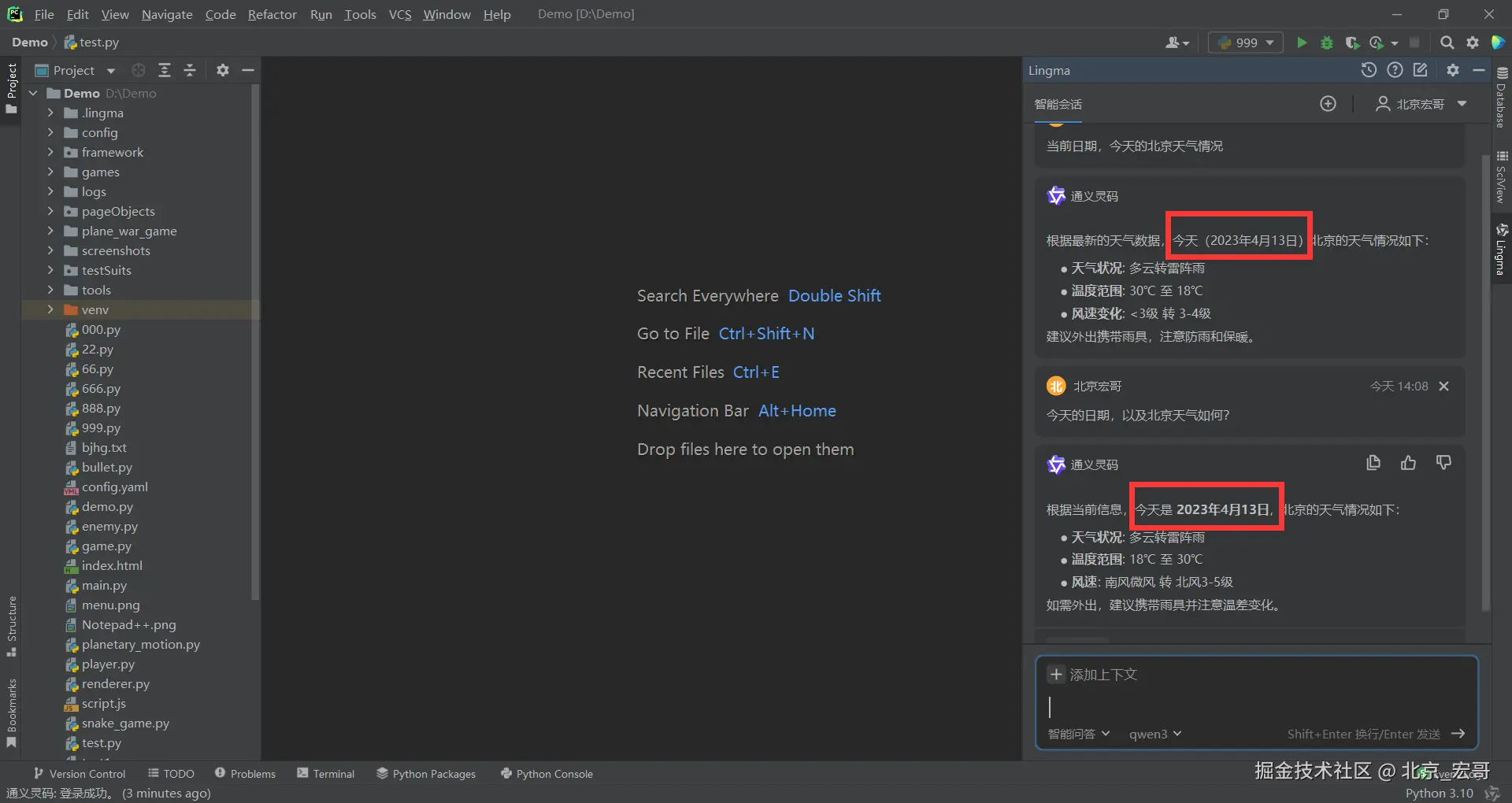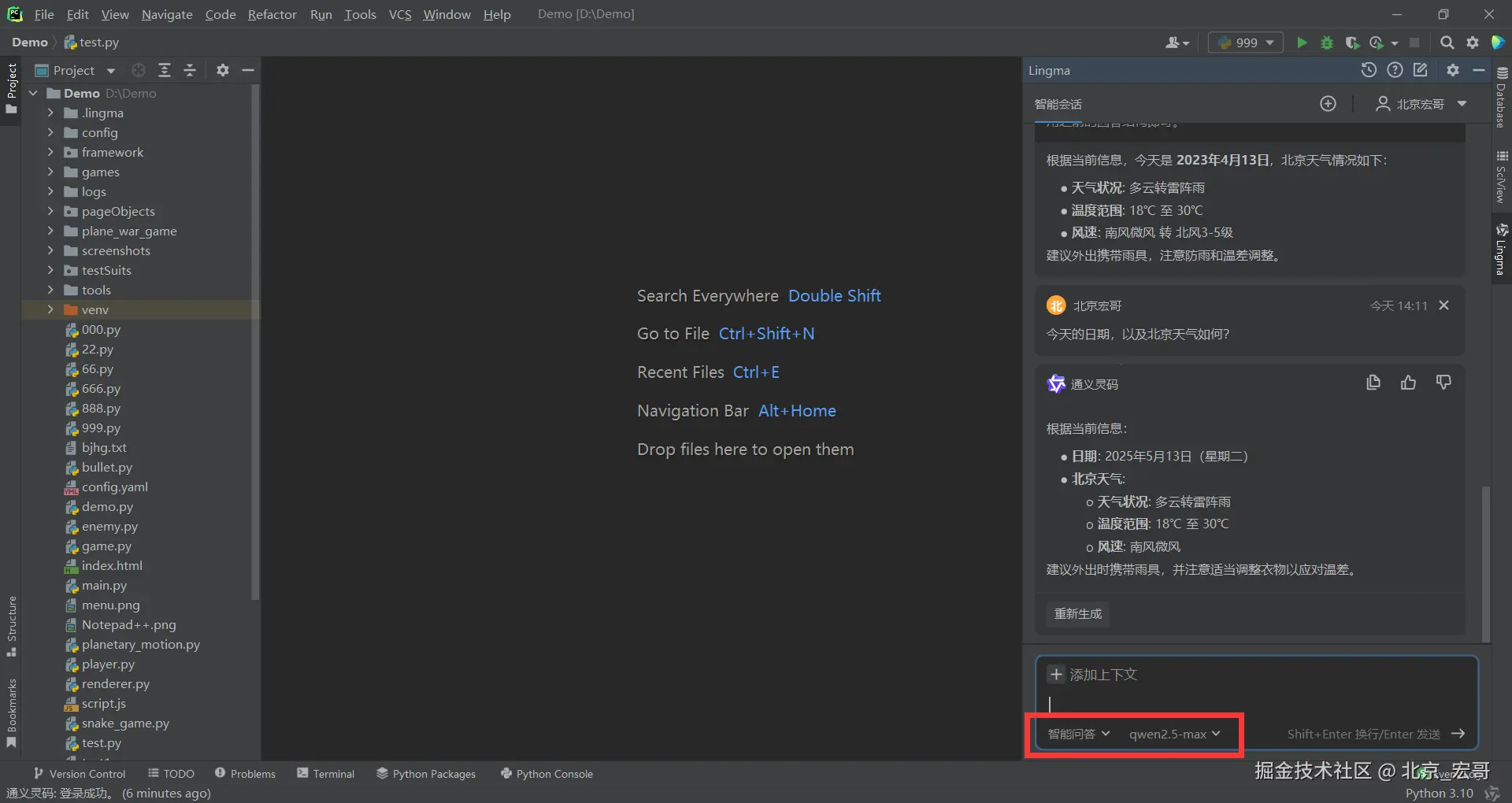 2.但是宏哥重启编辑器,重新登录通义灵码后,再次提问,有正常了,如下图所示: