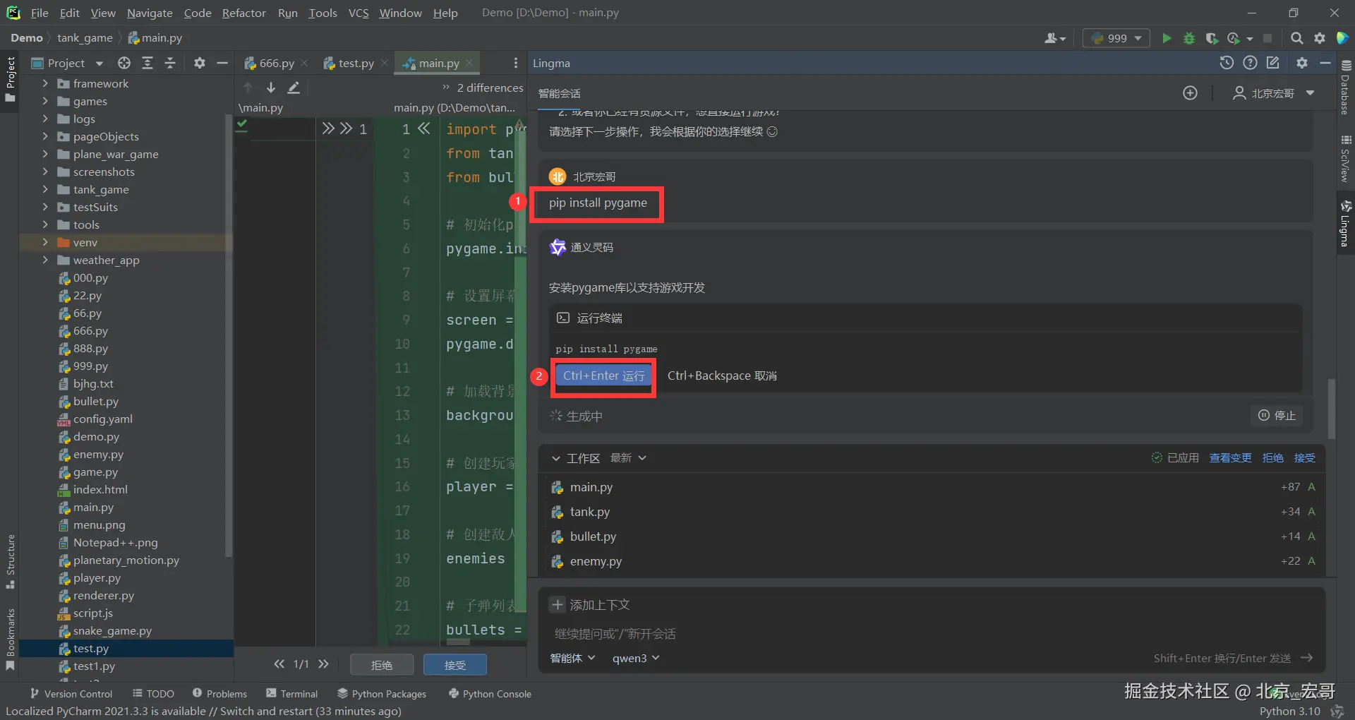 智能体模式可根据当前需求自主决策进行终端命令编写与执行,为保障命令执行的确定性,默认每次执行命令前需要开发者进行确认: