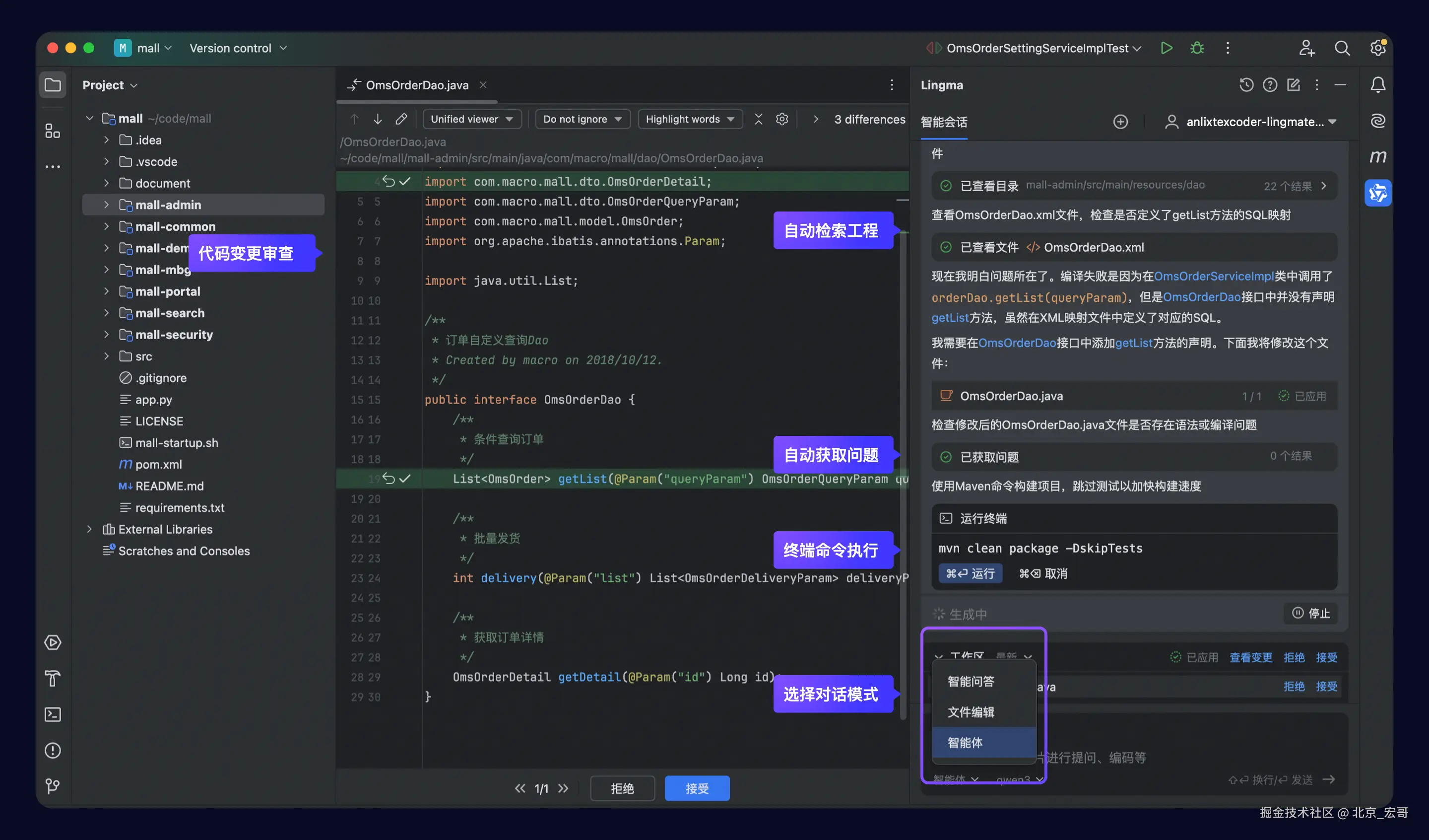 如果希望 AI 根据你的需求对所选上下文中的文件进行局部修改,例如增加注释、新增小功能、或进行页面局部优化等场景,可选择文件编辑模式。该模式要求你提供准确的上下文信息和清晰的需求描述,AI 将高效完成执行。其优势在于生成速度快,但不会进行多步推理或主动探索工程结构。这部分宏哥在2.0的版本中已经体验过,这里就不再赘述,有兴趣的小伙伴或者童鞋们,可以查看宏哥之前发布的文章。
