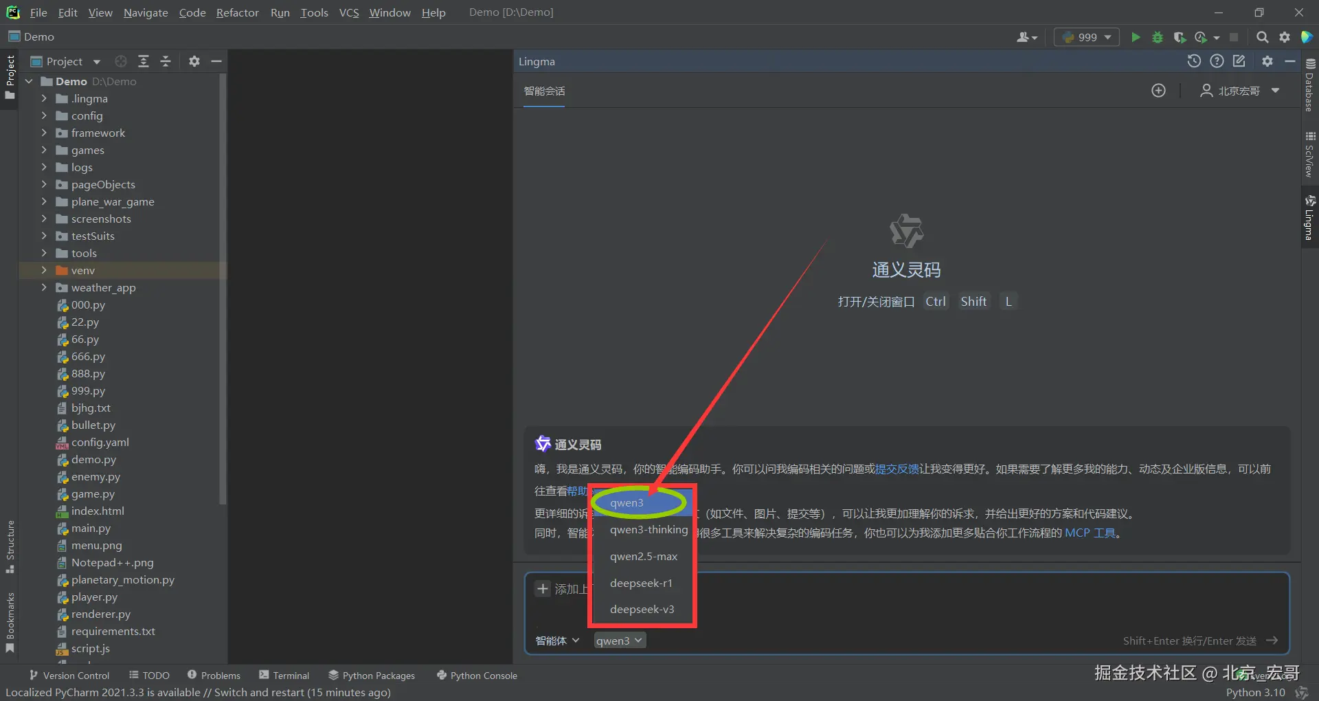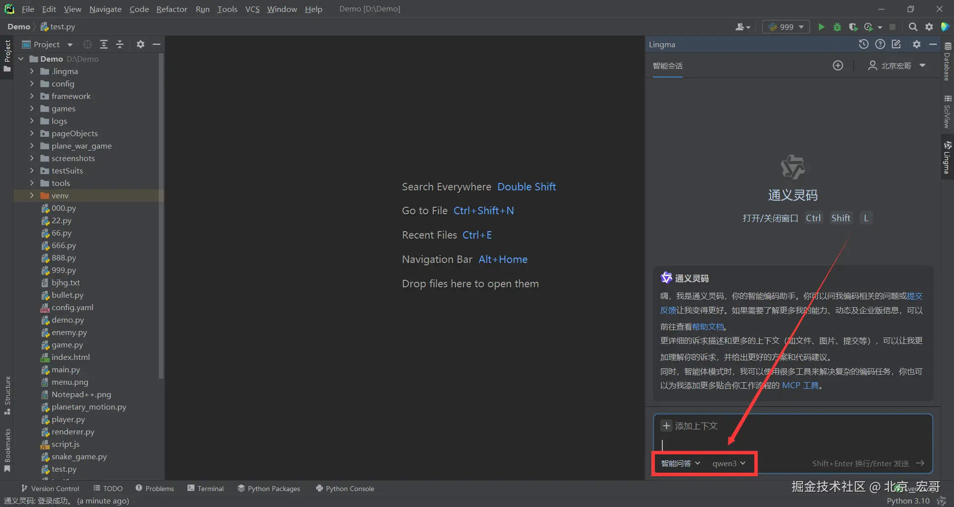 1.宏哥选择模式:智能问答,模型:Qwen3 ,如下图所示: