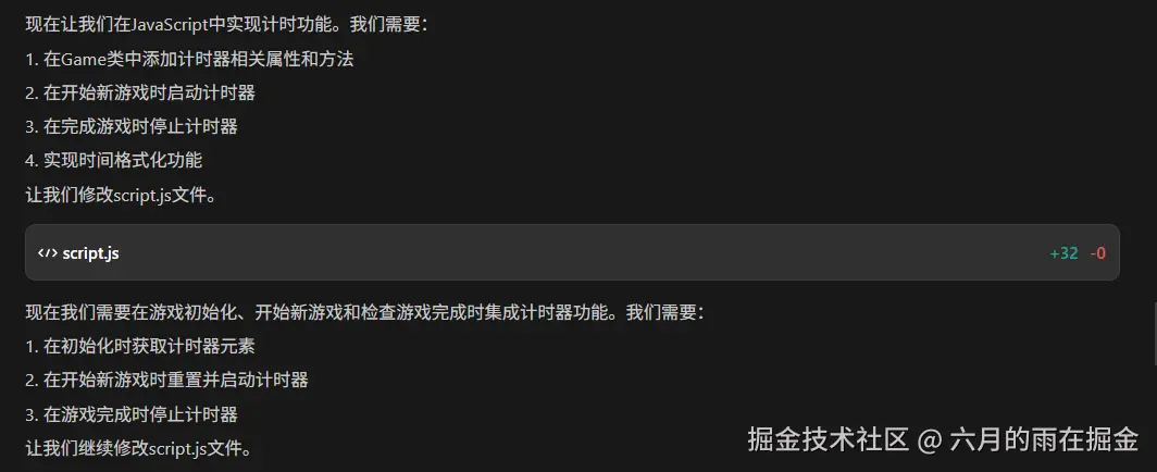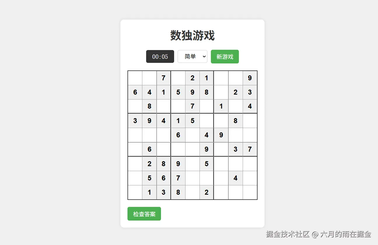 这里我们可以看到Craft 在对现有的文件进行修改的时候,会基于已经发生的情况再次就行判断修改,就像上面对我们的script.js 文件进行了多轮次的分析修改,最终完成对数独游戏计时功能的添加。下面我们在浏览器刷新我们的本地 index.html 页面,就可以看到我们的数独游戏已经增加了计时功能,同时每次点击【新游戏】会自动重置计时器