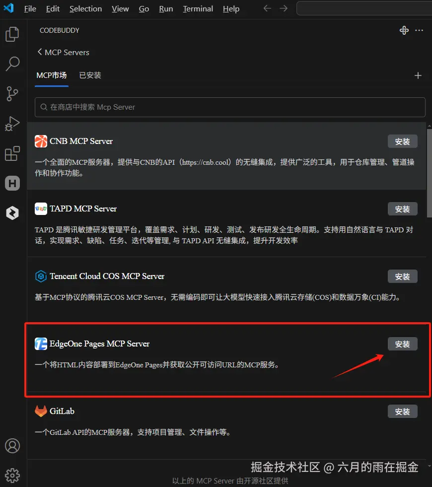 在CodeBuddy 对话框选择【MCP 市场】,找到我们需要的MCP 并点击右侧的【安装】,这里需要说明的是如果本地没有安装Node.js 的话,这里点击安装会安装失败,需要你安装Node.js之后再尝试