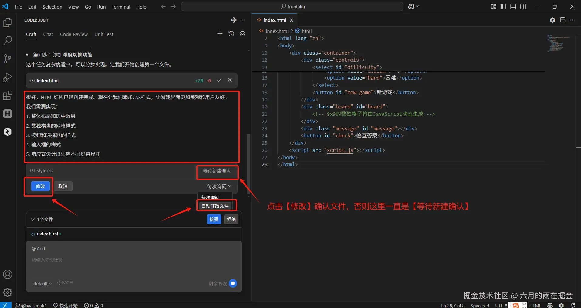 到这里我想说,虽然我本身并不是前端开发者,前端开发工具VSCode也是今天刚下载安装的,Node.js 部署环境也是现装的,但是真的实现一个数独小游戏,却是一点也不难。感觉上就是有了CodeBuddy ,即使是陌生的环境,陌生的开发工具,一样可以达到自己期待的效果,并且效果还不错。