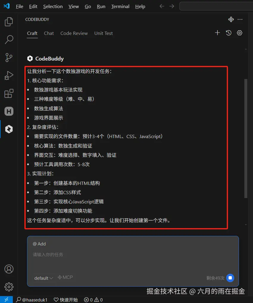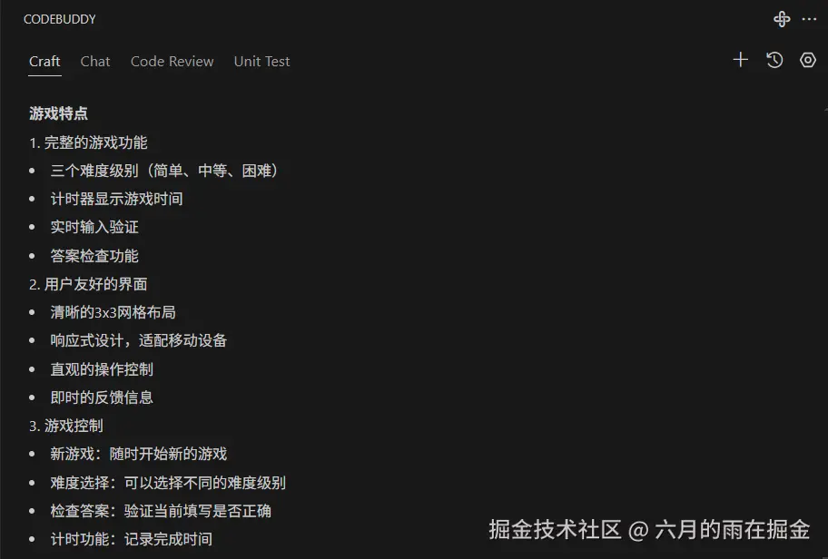 那么我的需求就出来了【你是一个小游戏开发专家,具有丰富的游戏开发经验,我需要你开发一个数独小游戏,需要支持难,中,易三种难易度切换,锻炼玩家数字敏感性。现在,帮我生成完整的代码吧。】在输入我们的要求后,Craft会对我们的需求进行一个分析整理,包括游戏的核心功能、复杂度评估、实现计划等
