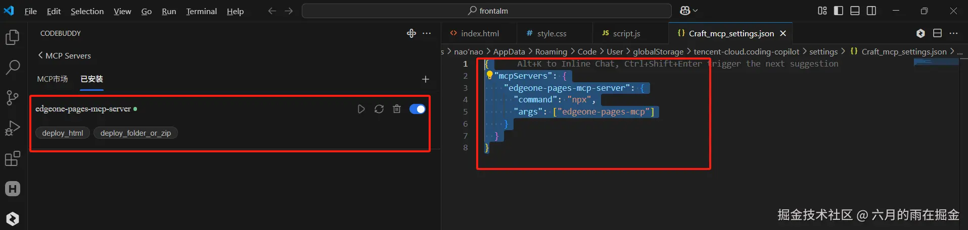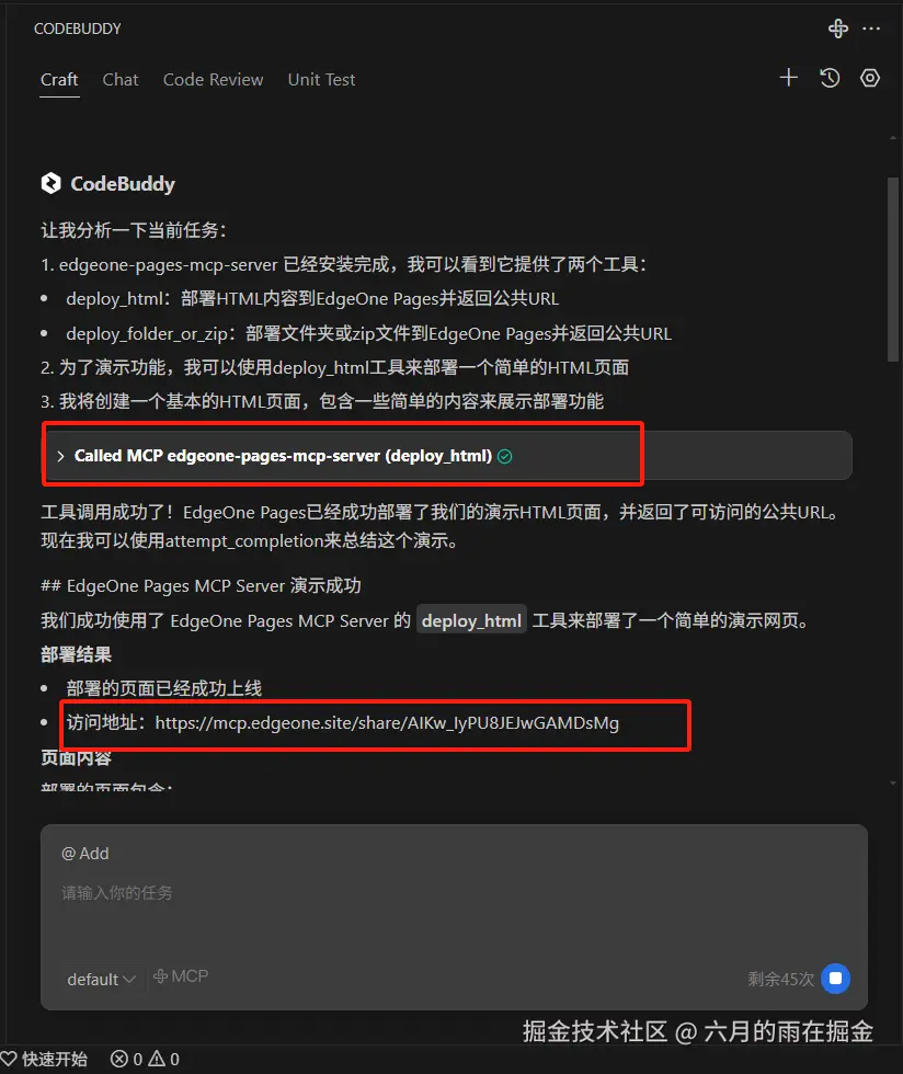 那么什么是Pages MCP Server?EdgeOne Pages Deploy MCP 是一项专用服务,能够将 HTML 内容快速部署到 EdgeOne Pages 并生成公开访问链接。看到没,刚才我说的,自己用Craft 生成了一个数独游戏,但是只能自己在本地玩儿,有点太小气,那么我们就可以通过EdgeOne Pages Deploy MCP 将我们的数独小游戏 HTML 页面快速部署到EdgeOne Pages 并生成公开访问链接,有了公开访问链接,我们就可以让更多的小伙伴一起玩耍起来了。