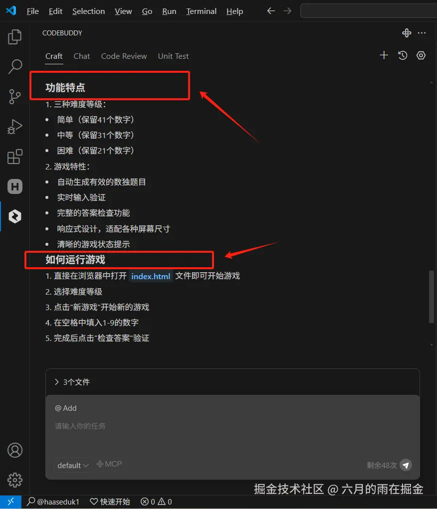 这里Craft 除了生成数独游戏需要的文件外,还对当前数独游戏的功能特点(包括游戏的难易度介绍、游戏特性自动生成题目、答案检查等)以及如何运行游戏都进行了详细的说明,方便我们后续直接体验