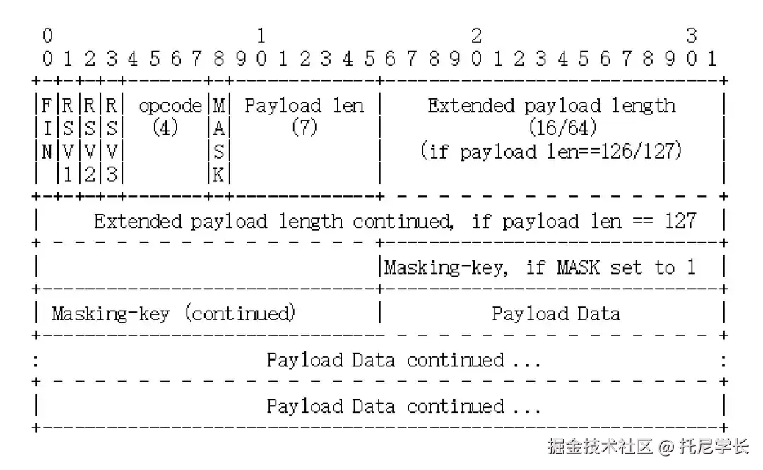 - Opcode (4 bits):定义数据类型(如文本 0x1、二进制 0x2、关闭连接 0x8、Ping 0x9、Pong 0xA)。