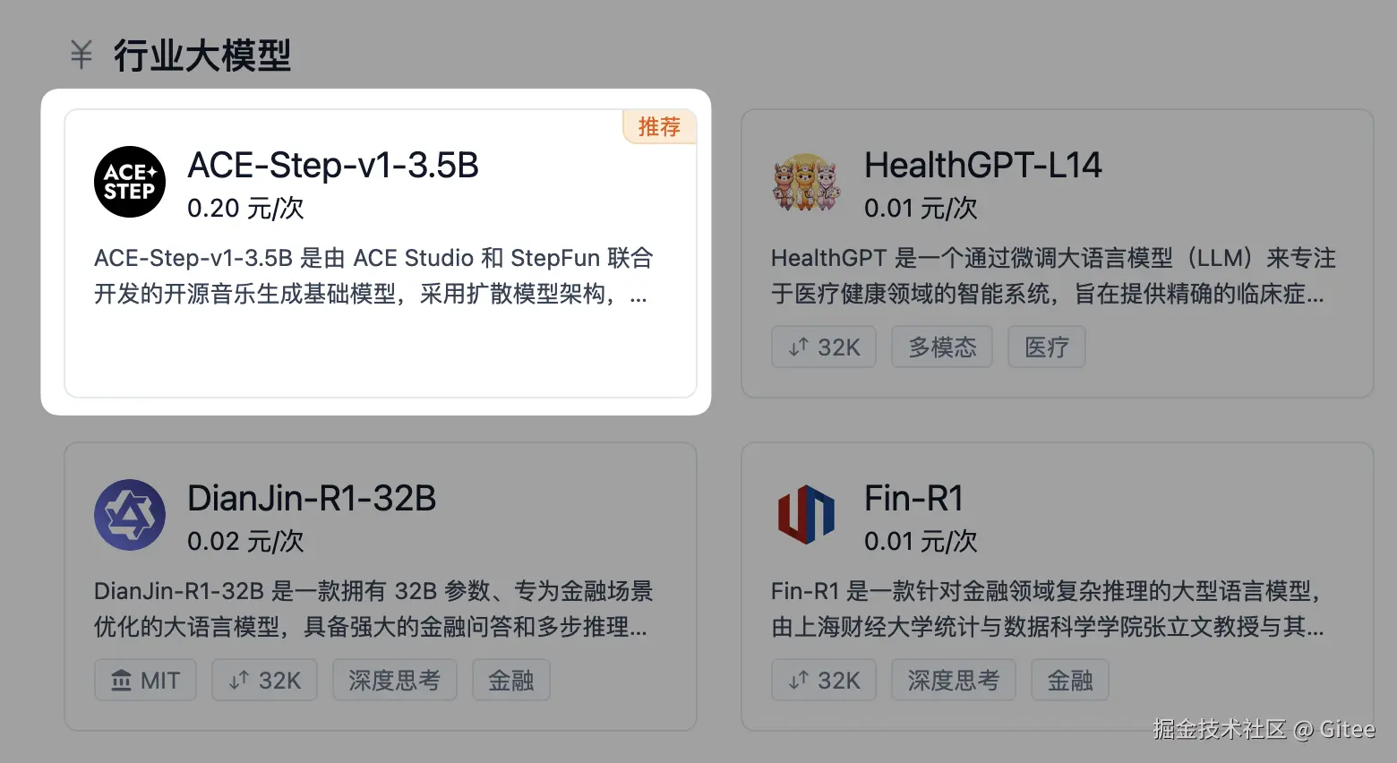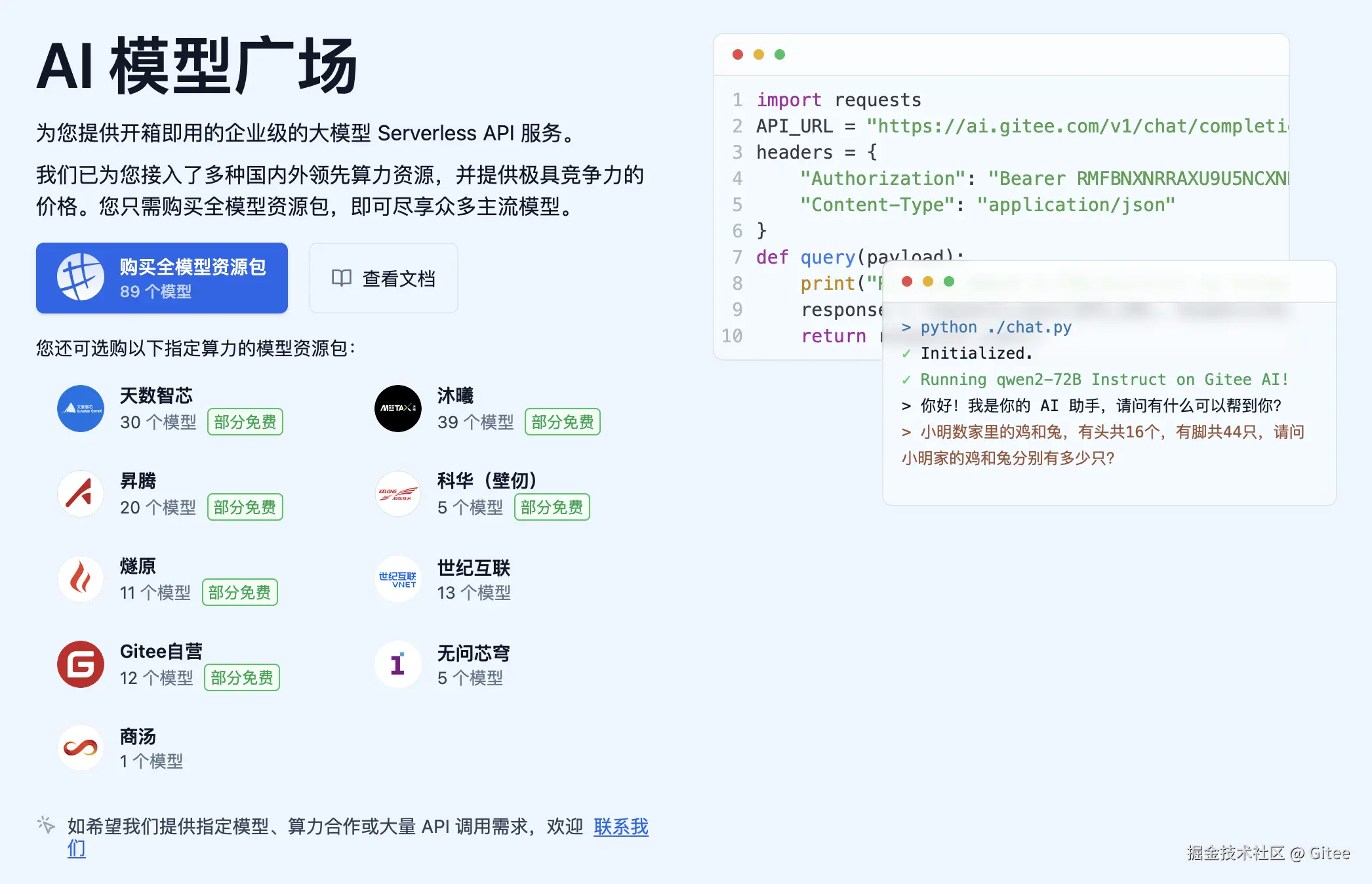 模力方舟的 AI 模型广场提供了行业大模型、文本生成、视觉模型、语音多模态、图像生成与处理、3D生成、文档处理/OCR、视频生成、自动语音识别、语音合成、向量化和重排、代码生成、风控识别、音乐生成十四大类共 89 款各领域的顶尖开源模型的在线体验和 API 使用。通过购买模型资源包,即可通过极低的价格即可尽享众多主流模型。