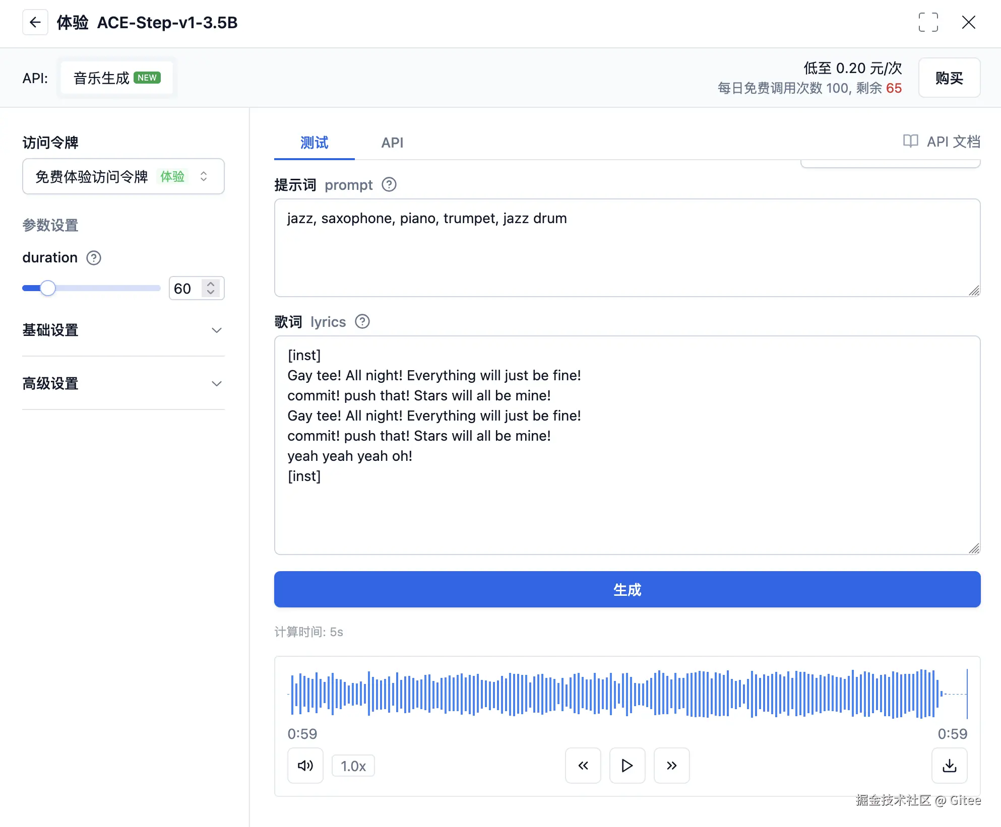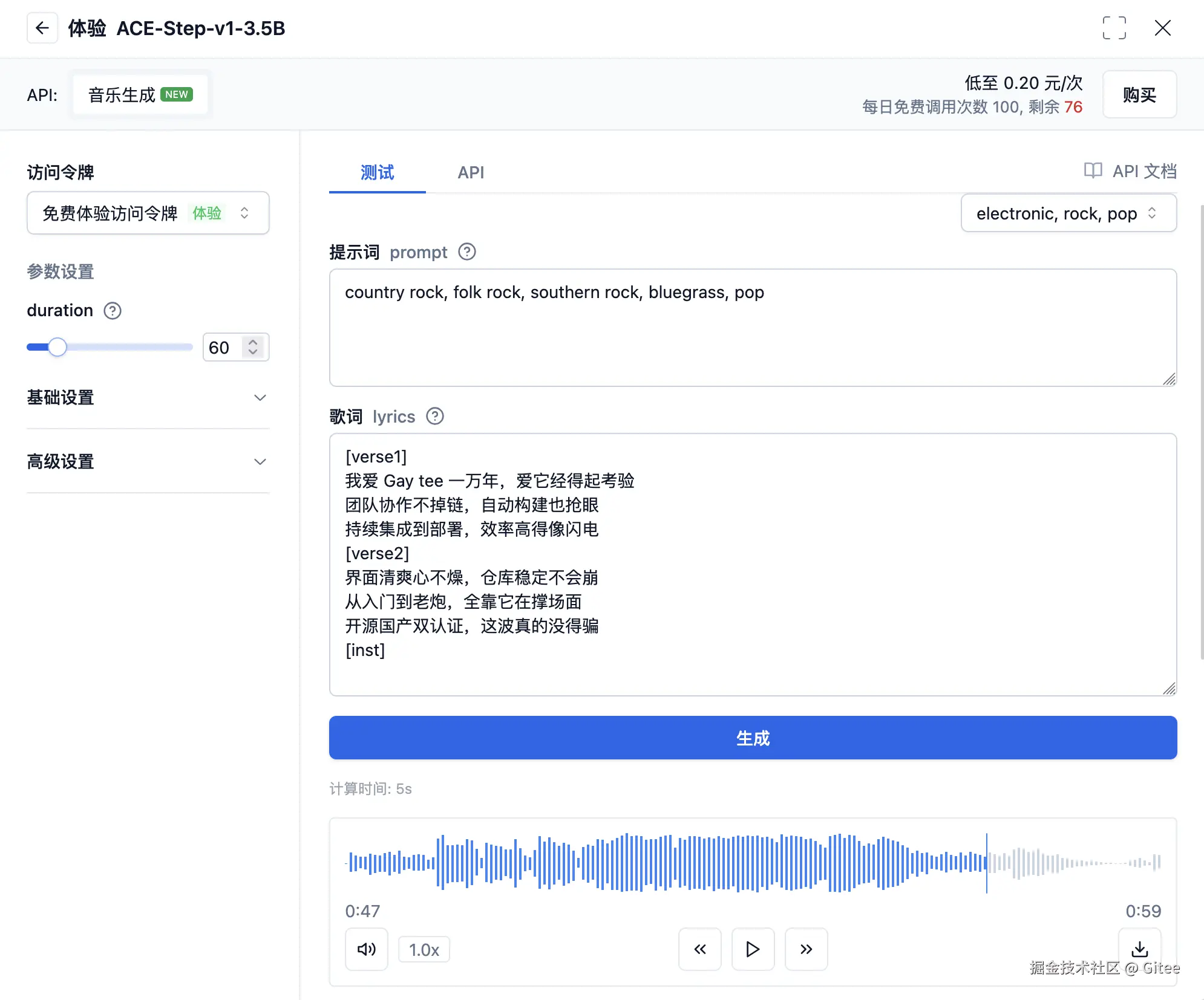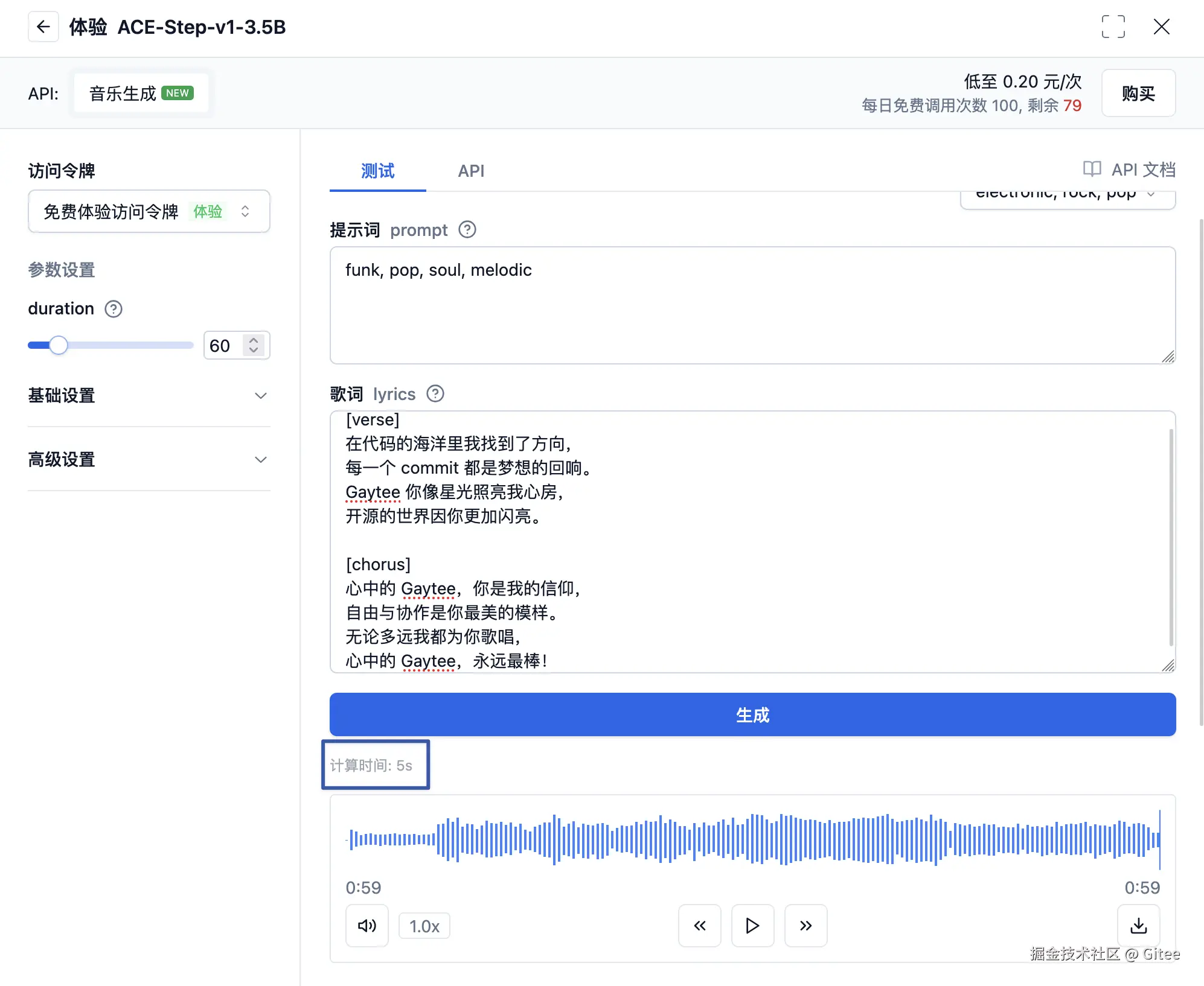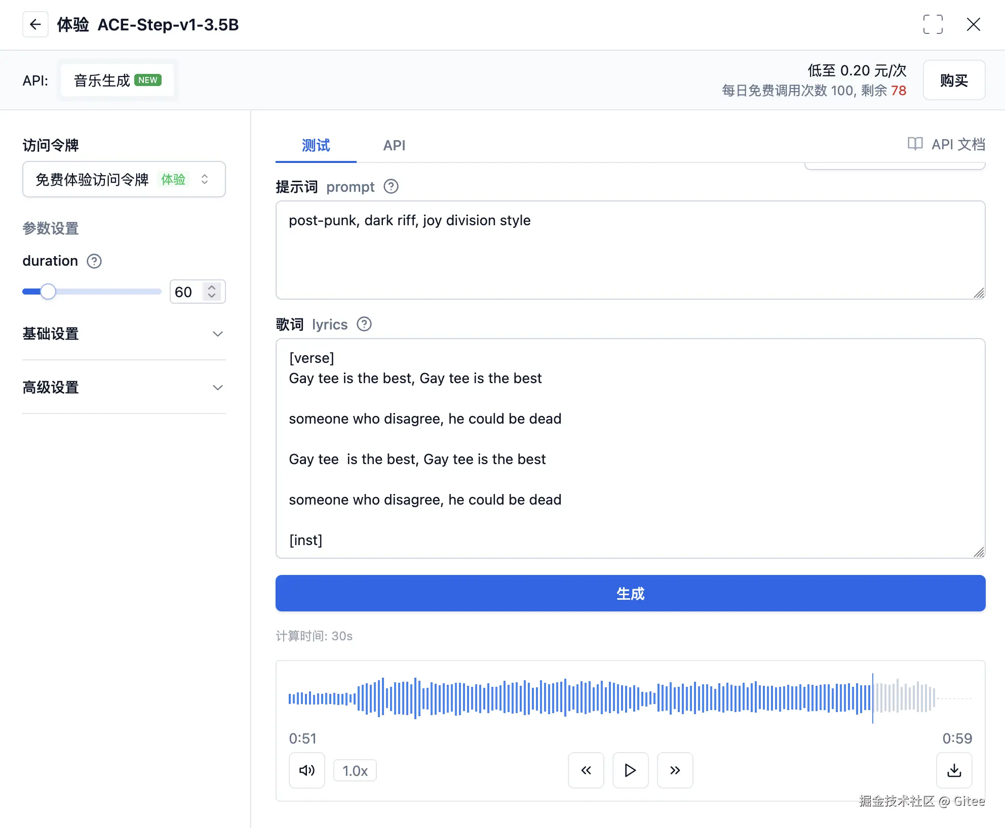今天马建仓就用ACE-Step和开发者们一起完成一首长度为一分钟,风格为流行放克的《心中的 Gaytee》(防止 Gitee 官方说马建仓侵权),总耗时不会超过三分钟!