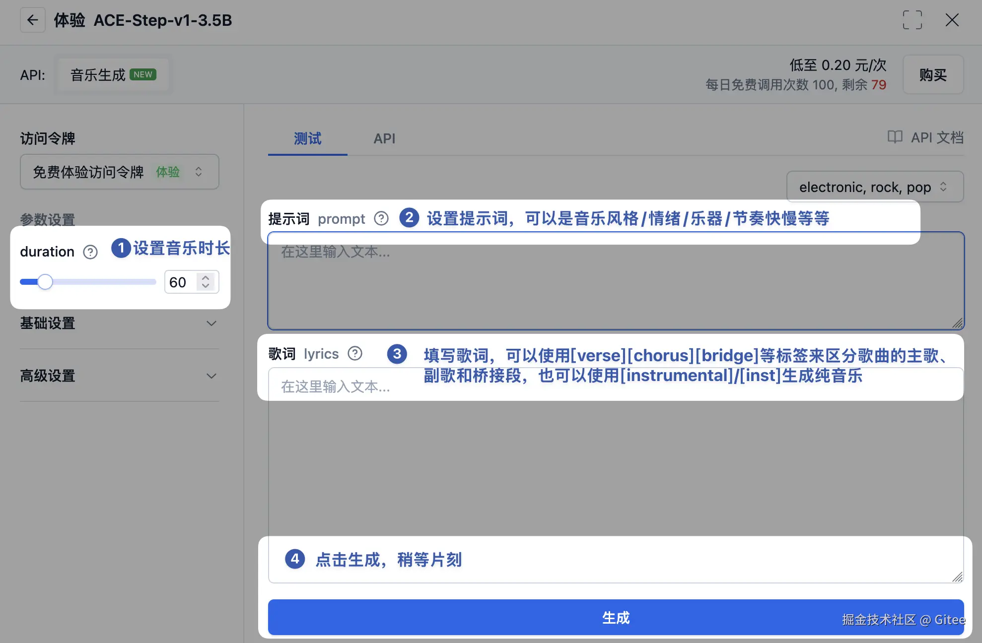 没错!有了歌词后你就可以开始发挥你深藏已久的音乐天分了,进入ACE-Step的体验页面,这里就是你的录音室了!