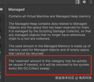 A:Unity会自动调用GC且不推荐手动调用。并且就像截图里提到的,若六次GC扫描都用不到的内存就会被回收给系统。