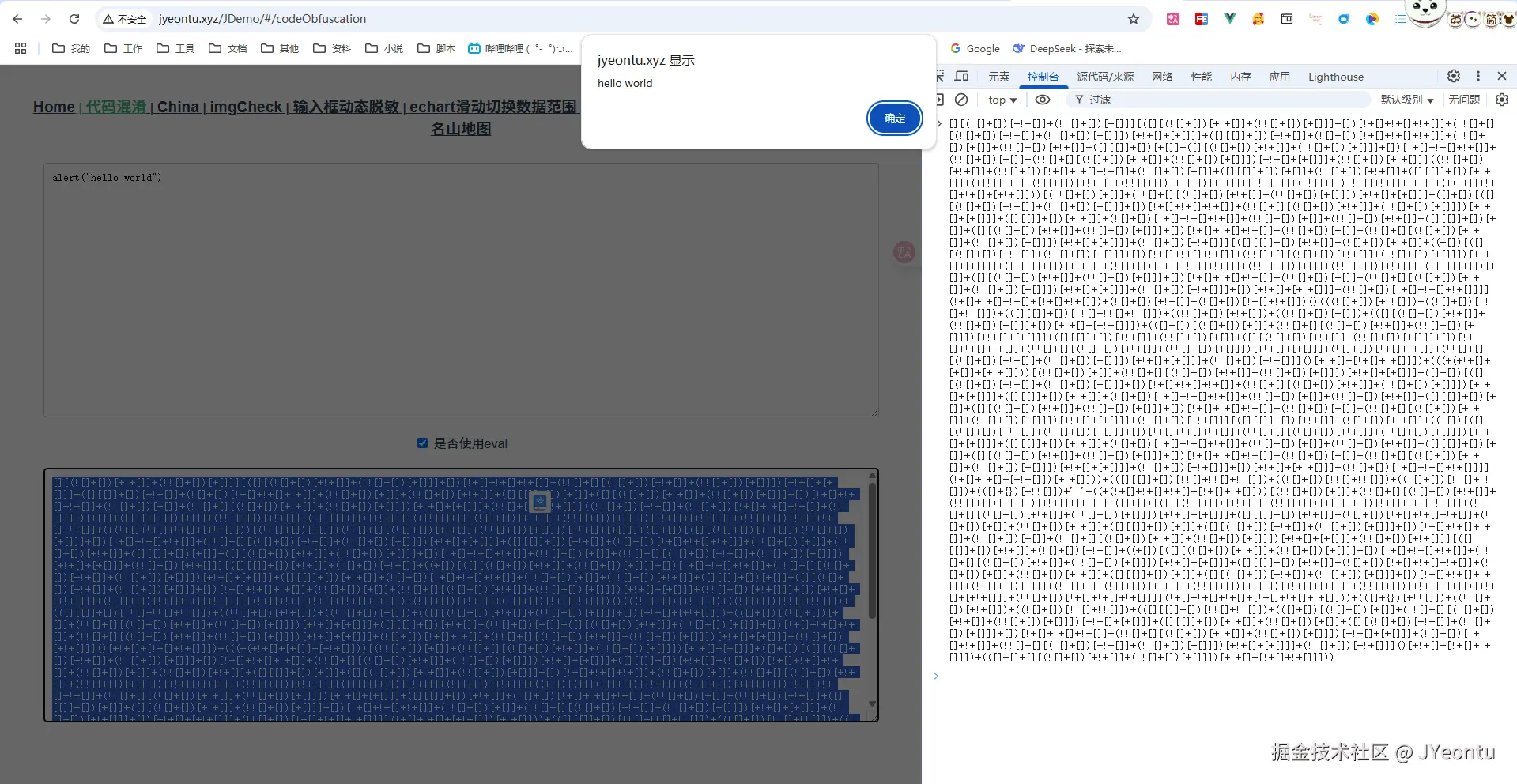 通过对前面那串神秘字符的分析,我们也知道了它的核心思路就是通过JavaScript的隐式类型转换规则对字符进行转换,那么我们是不是可以将我们的代码也都转换成这些字符,来达到一个代码混淆的效果呢?